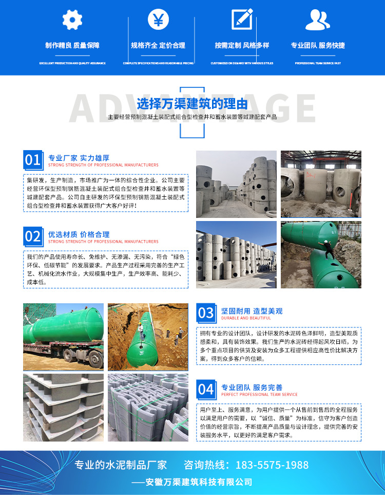 安徽萬渠建筑科技有限公司是集研發(fā),生產(chǎn)制造,市場(chǎng)推廣為一體的綜合性企業(yè)。公司主要經(jīng)營環(huán)保型預(yù)制鋼筋混凝土裝配式組合型檢查井和蓄水裝置等城建配套產(chǎn)品。產(chǎn)品生產(chǎn)過程采用獨(dú)特的生產(chǎn)工藝,機(jī)械化流水作業(yè)。產(chǎn)品大規(guī)模生產(chǎn),生產(chǎn)效率高,耗能少,成本低,產(chǎn)品使用壽命長、免維護(hù)、無滲漏、無污染,符合“綠色環(huán)保,低碳節(jié)能”的發(fā)展要求,是傳統(tǒng)磚砌井池的理想替代產(chǎn)品。